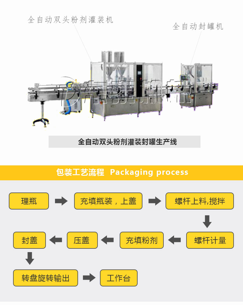 全自動粉劑灌裝機是我公司的主打產(chǎn)品,根據(jù)客戶的要求公司開發(fā)出了單頭、雙頭、四頭、六頭瓶裝生產(chǎn)線,全自動奶粉灌裝機專門針對藥品、保健品、食品行業(yè)的粉劑瓶裝。結(jié)合不同的客戶需求可配套:上料(螺桿、真空)、自動理瓶,單(雙)頭加塞、旋蓋、軋蓋、壓蓋等,鋁箔封口(風(fēng)冷、水冷),金檢,鋁箔塞墊,貼標(biāo),碼瓶熱收縮,裝盒,三維包裝(帶金線),裝箱等。