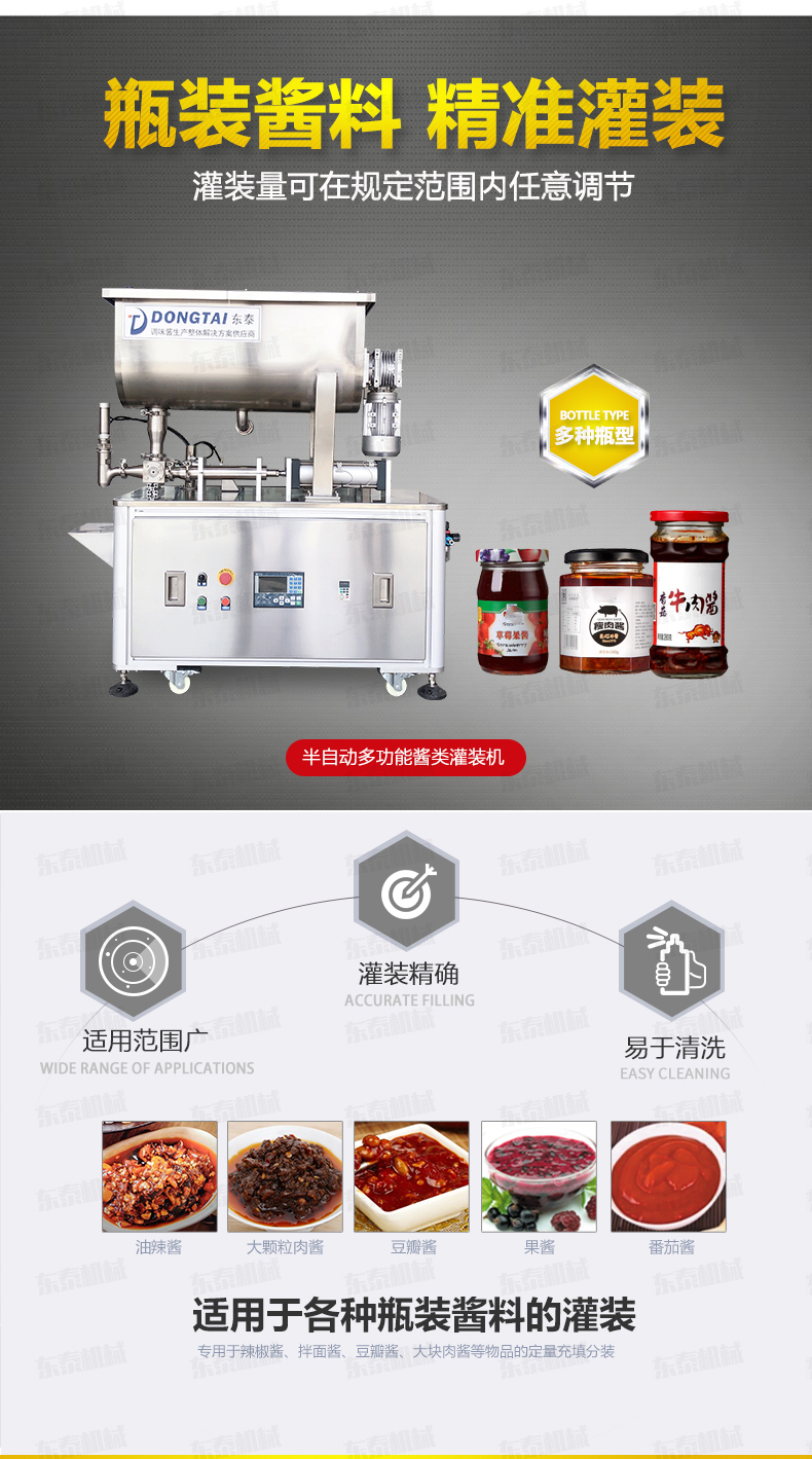 半自動灌裝機械,配置的自動攪拌器,保證了醬和油的充分混合,可灌裝顆粒漿狀流體物料在對辣椒醬、拌面醬、豆鼓等醬類進行灌裝時,灌裝量可在規(guī)定范圍內(nèi)任意調(diào)節(jié),計量誤差小,該半自動醬類灌裝機采用壓縮空氣為動力可在各種環(huán)境中使用。