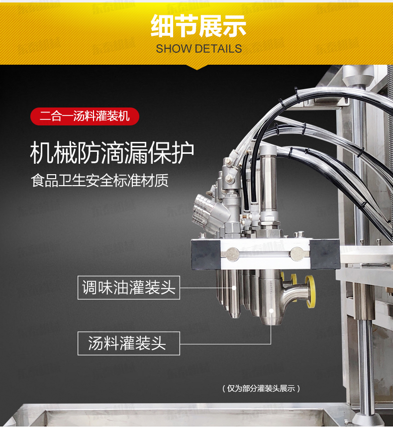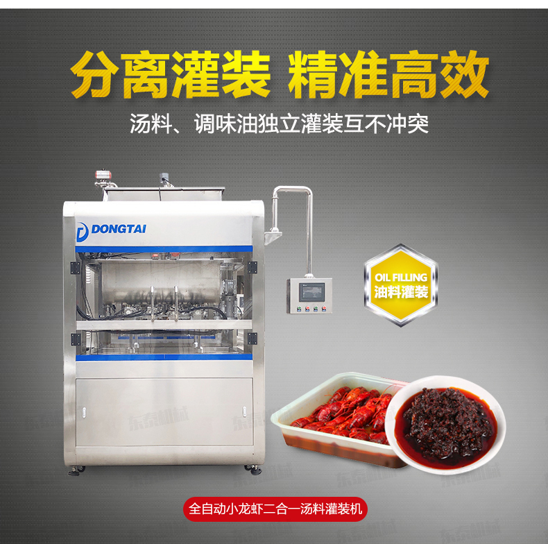 1.灌裝機(jī)在參考國(guó)外同類產(chǎn)品的基礎(chǔ)上進(jìn)行改良設(shè)計(jì),特制湯料、調(diào)味油灌裝頭,機(jī)械防滴漏保護(hù),在灌裝過程中不會(huì)污染包裝容器。