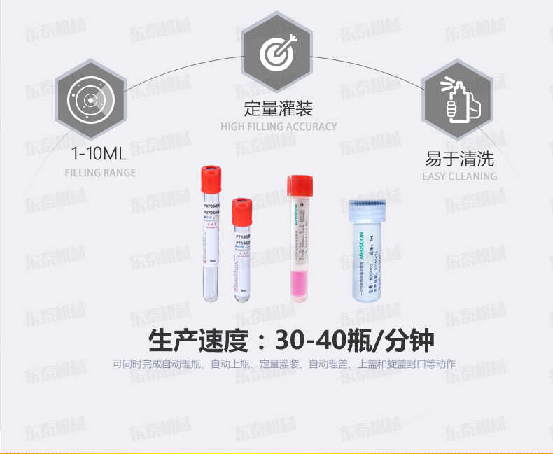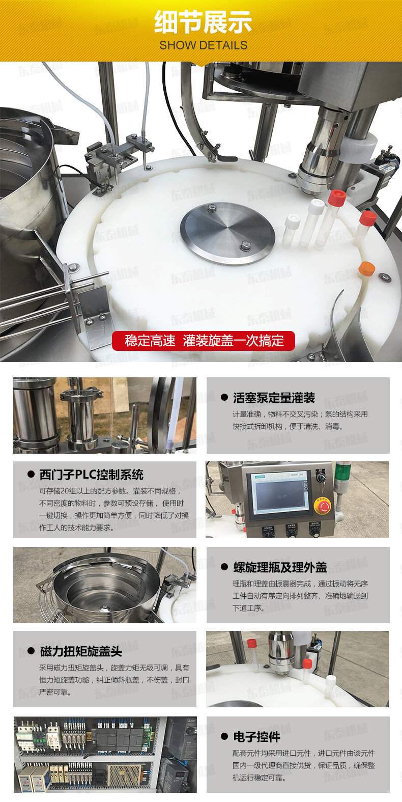 設備簡介: 本機是在引進和吸收國外技術的基礎上,由我公司自主研發的一款IVD診斷試劑灌裝旋蓋一體機,能同時完成自動理瓶、自動上瓶、定量灌裝、自動理蓋、上蓋和旋蓋封口等動作。本機采用日本高