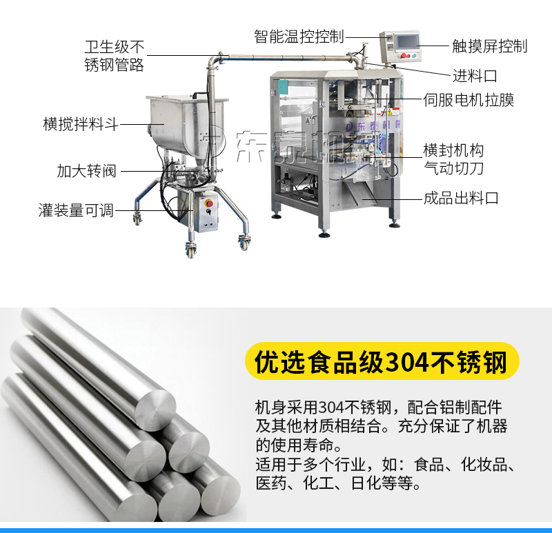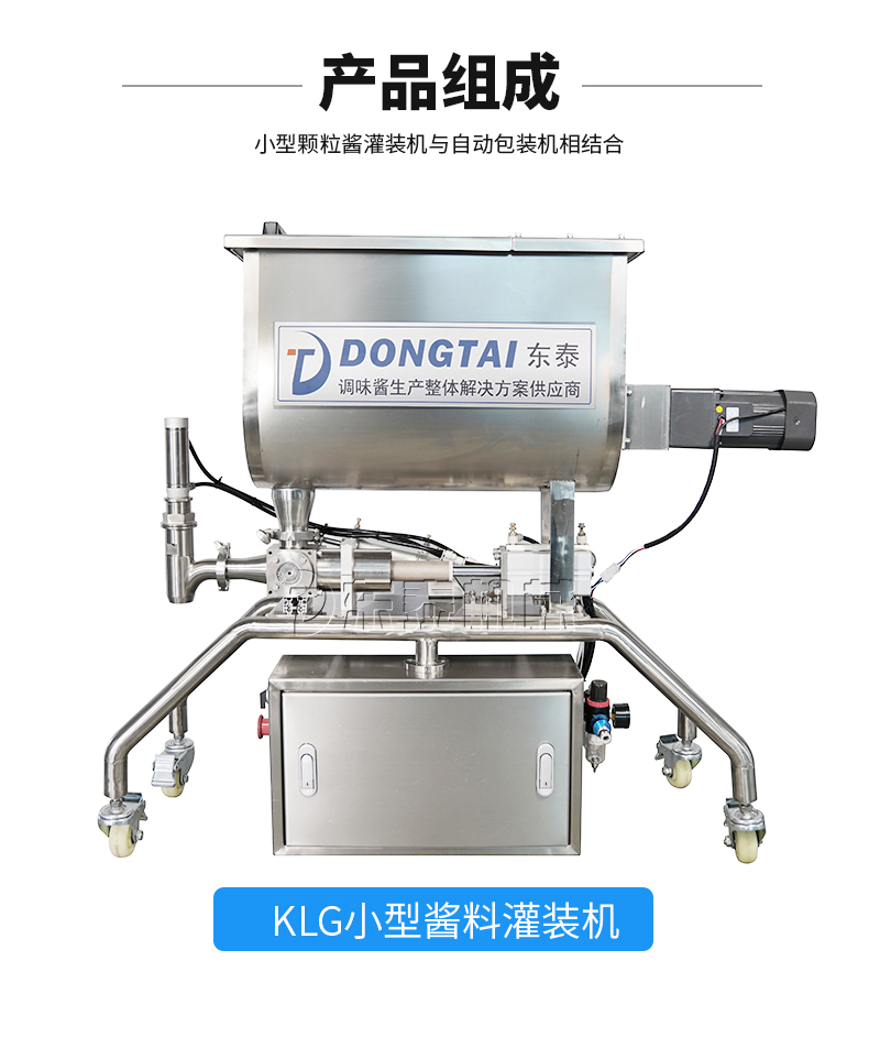 本機器主要用于調味品醬料的自動化包裝,機器安裝有橫向螺帶式攪拌,使油醬混合均勻,確保灌裝精度和產品包裝成品的均勻性。灌裝計量設備安裝有萬向輪,管路鏈接均采用快拆接頭,方便灌裝機拆卸移動清洗。包裝設備采