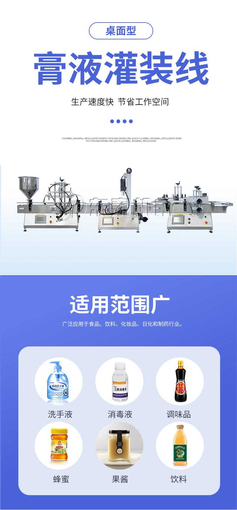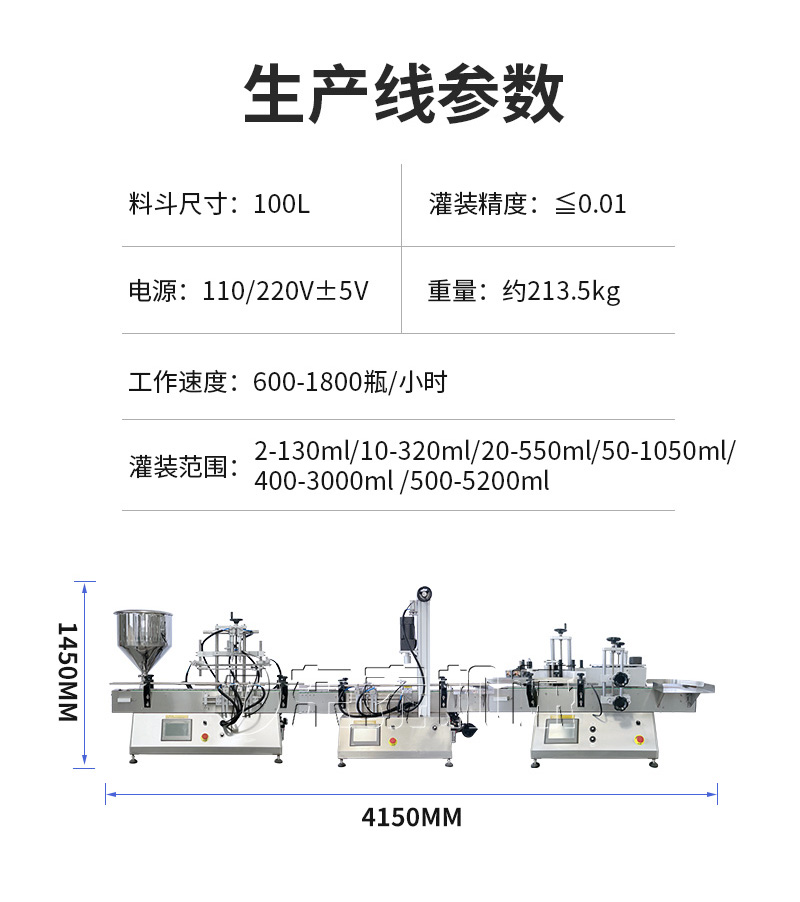 產品說明:生產線根據灌裝范圍選擇型號,灌裝部分為雙頭下潛式灌裝機,適用于不同物料不同瓶子的灌裝,配備自動壓蓋機和圓瓶貼標機,可實現不同蓋子的旋蓋貼標工作。 本設備主要適用于食品、日常化工