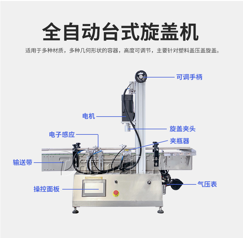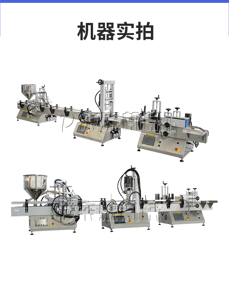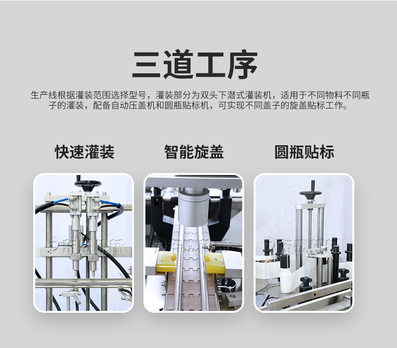 產品說明:生產線根據灌裝范圍選擇型號,灌裝部分為雙頭下潛式灌裝機,適用于不同物料不同瓶子的灌裝,配備自動壓蓋機和圓瓶貼標機,可實現不同蓋子的旋蓋貼標工作。
