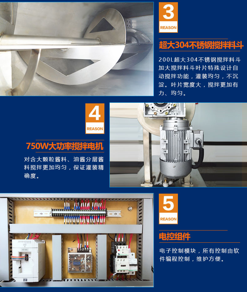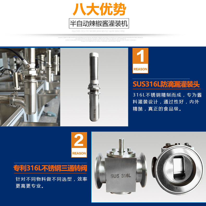 產(chǎn)品簡(jiǎn)介:半自動(dòng)醬類醬料灌裝機(jī)SFM系列結(jié)構(gòu)合理、機(jī)型小巧、性能可靠、定量準(zhǔn)確、操作方便。整機(jī)304不銹鋼,灌裝悶頭防漏料防滴油,氣缸驅(qū)動(dòng)結(jié)構(gòu),加大200L料斗,品牌全鋁殼銅芯大功率攪拌電機(jī),變頻調(diào)速,PLC智能控制,用戶可根據(jù)需要任意調(diào)節(jié)灌裝量及灌裝速度,灌裝精度高。