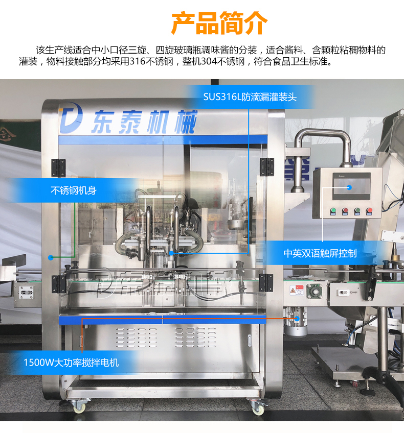 東泰機械通過十多年的努力和發(fā)展,現(xiàn)已成為集科研、設(shè)計制造、成套供應(yīng)、技術(shù)咨詢服務(wù)、工程總承包為一體的高科技型企業(yè)。如今專業(yè)的東泰技術(shù)團隊根據(jù)醬料市場研發(fā)推出的牛肉醬定量灌裝機設(shè)備得到市場的認可和用戶的青睞。同時這款自動化、智能化、效率化、功能化的醬料灌裝機械設(shè)備帶領(lǐng)著醬料市場進入規(guī);纳a(chǎn)領(lǐng)域中,為相應(yīng)企業(yè)提供方便、快捷、省時省力的現(xiàn)代化快節(jié)奏的發(fā)展。如果您有需求,歡迎您到東泰機械實地考察選購!