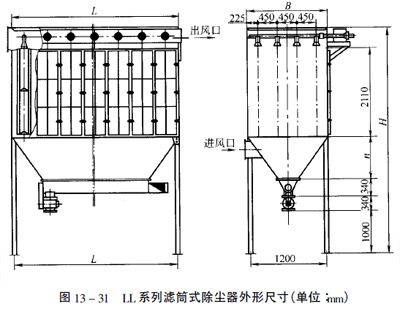 LL系列濾芯除塵器主要外形尺寸及安裝尺寸見圖13—31和表13—22。