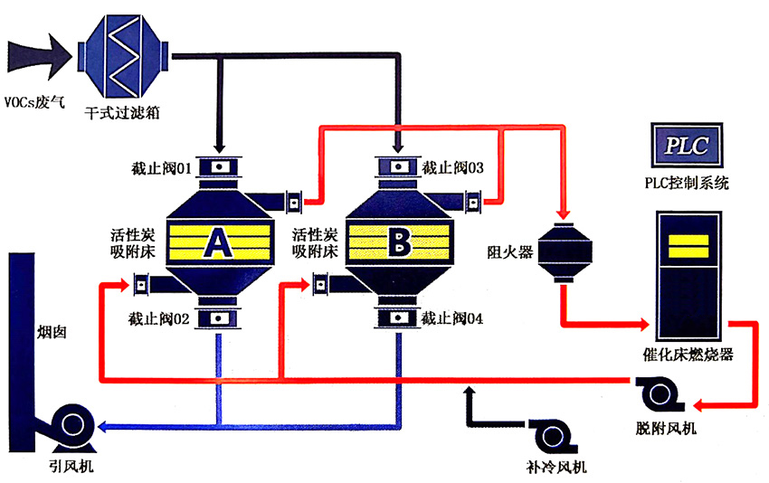 活性炭吸附脫附?催化燃燒裝置是根據(jù)吸附(效率高)和催化燃燒(節(jié)能)兩個(gè)基本原理設(shè)計(jì),采用雙氣路連續(xù)工作,一個(gè)催化燃燒室,兩個(gè)或多個(gè)吸附床交替使用。脫附下來(lái)的有機(jī)物已被濃縮(