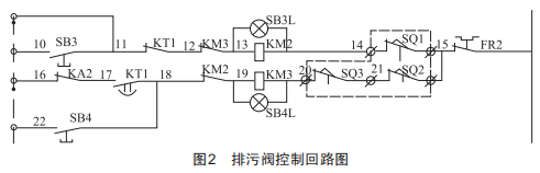 (1)關限位誤動??刂葡淝惺謩?排污閥控制回路如圖2所示,圖中10~22為接線端子編號,sB4是排污閥關按鈕,按下sB4如果電機二次回路無反應,先檢查s02(內限位)和s03(外限位)是否發生誤動,當任何一個限位發生誤動,排污閥關閉無反應。此時應該檢查出現異常的限位開關,對其進行處理或更換。