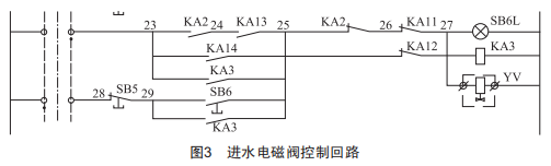 進水電磁閥控制回路如圖3所示,圖中23~29為接線端子編號,除塵器上水流程是電磁閥YV打開,水位到達備用水位時,觸發KA11動作,KA11的常閉節點斷開,電磁閥失電,停止注水。導致水箱漫水的原因主要有以下幾種: