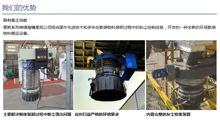 伸縮式卸料管的優勢:1.無塵裝載:我們的裝載系統確保工作區域無塵,防止污染并確保港口和環境的安全。2.多功能性:適用于各種散裝固體輸送和儲存系統。無論您使用的是料倉、漏斗、螺旋